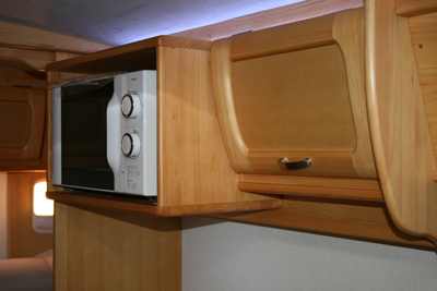 場所は車両後部エントランス側になり、上には電子レンジが収納可能な棚、下にはシンクが付いております。